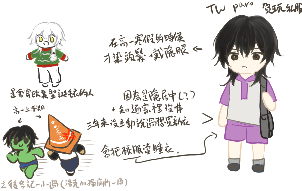 其實內心真正的性格本來是愛吵又愛鬧,但因為在國中的環境下逐漸變得封閉自己,不敢與人有過多的交流。